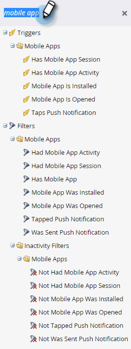 在右侧面板中搜索“移动设备应用程序”,可列出所有移动设备应用程序触发器和过滤器。