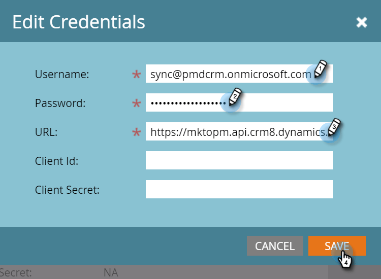 输入 用户名、密码 Microsoft Dynamics URL 和 客户端ID/密码。 完成后单击 保存。