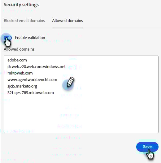 列入允许列表选择 启用验证 滑块以激活您的。 输入允许的域,然后单击 保存。