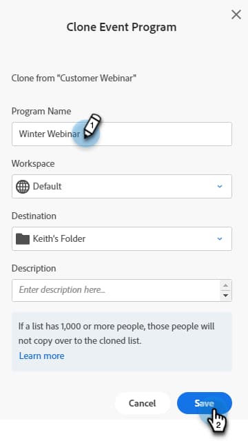 note note NOTE 目前,您只能将克隆的交互式网络研讨会另存为交互式网络研讨会。 将克隆的网络研讨会另存为合作伙伴网络研讨会(例如Zoom、ON24等)将很快可用。 -