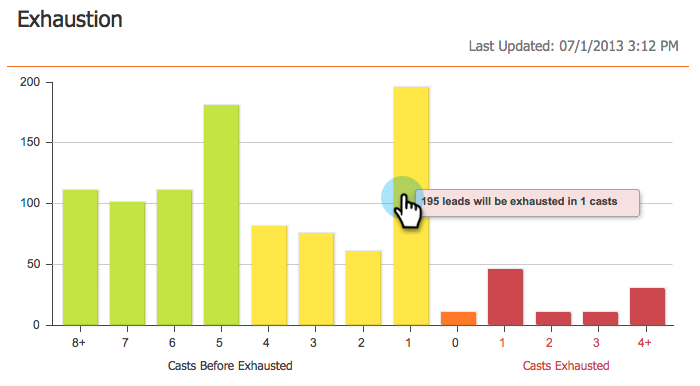 此构件可帮助您预测潜在客户何时将耗尽所有内容。 在每次播放后立即计算耗尽分数。 下面的示例显示,在1个转换中,195个潜在客户将耗尽所有内容。