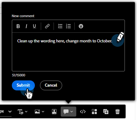 电子邮件协作和注释允许营销团队在Adobe Marketo Engage Email Designer中无缝地审核、讨论和最终确定电子邮件资产。 您可以实时评论、建议编辑和解决反馈,而不是通过外部工具(如聊天、电子邮件线程、电子表格等)共享草稿。 这可以简化工作流程,减少错误,并确保在发送电子邮件营销活动之前与利益相关者保持一致。