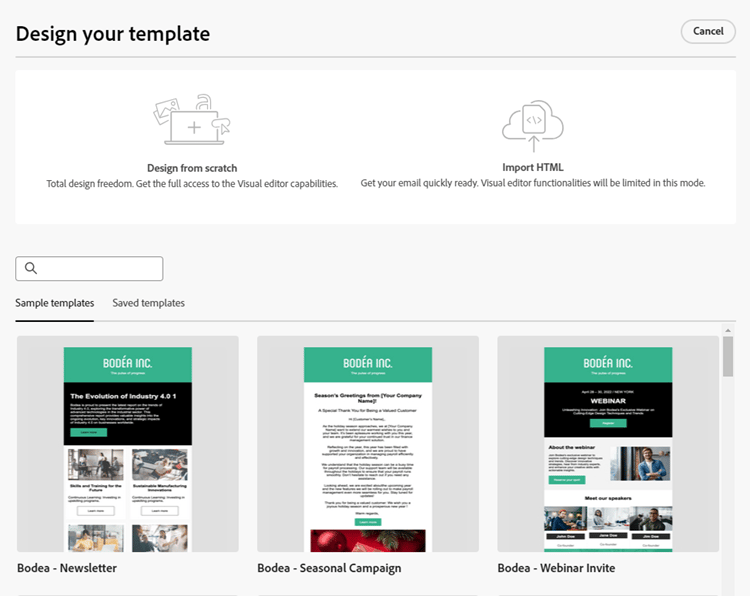 示例模板: Marketo Engage提供了四个现成的电子邮件模板。