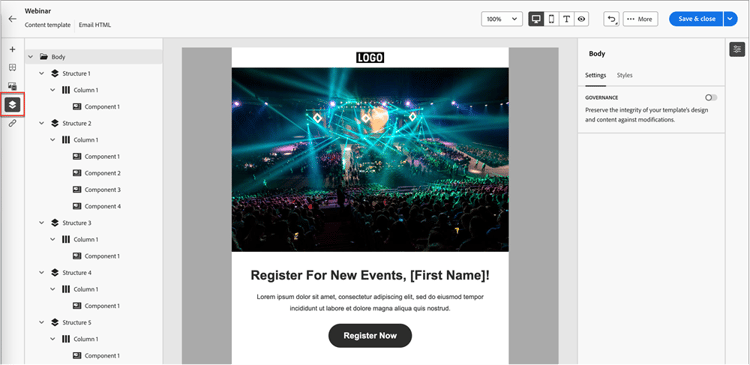 为了加快并改进设计过程,您可以创建独立的电子邮件模板以轻松重用自定义内容。