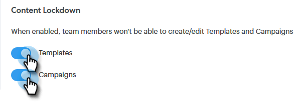 向下滚动到Content Lockdown。 打开任一滑块将 禁用 您的团队成员创建/编辑模板和/或营销活动的能力。
