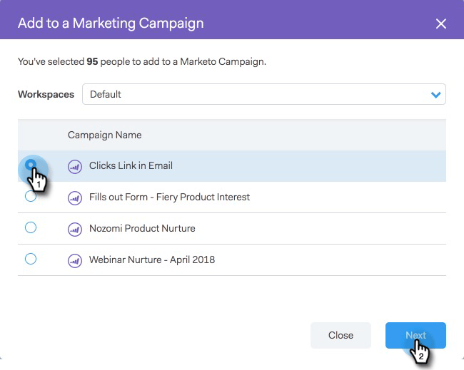 note note NOTE 如果您看不到所需的工作区,请确保管理员通过Marketo团队访问页面进行了配置。 -