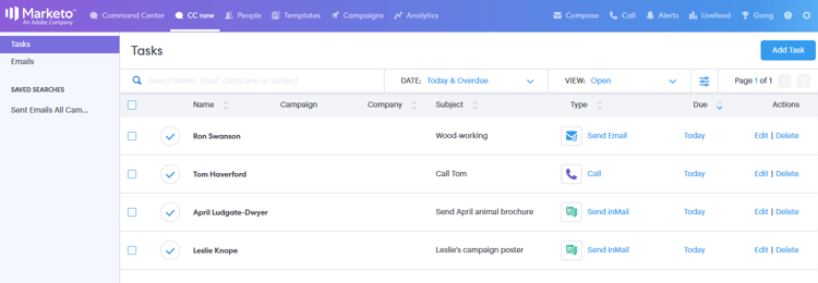 在Command Center的电子邮件部分,您可以管理所有电子邮件活动。 将其视为您的电子邮件发件箱,以审阅从Sales Connect发送的电子邮件。 管理您的计划电子邮件,查看谁一直在处理您的电子邮件,检查您的电子邮件是否传送有任何问题等等。