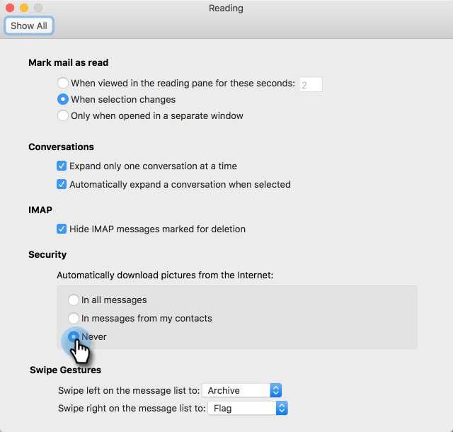 单击左侧菜单中的Automatic Download,然后选中 Don’t download pictures automatically in HTML email or RSS items 复选框。