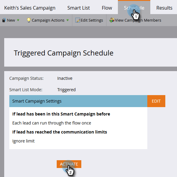 单击 Schedule 选项卡,然后单击 Activate 营销活动。