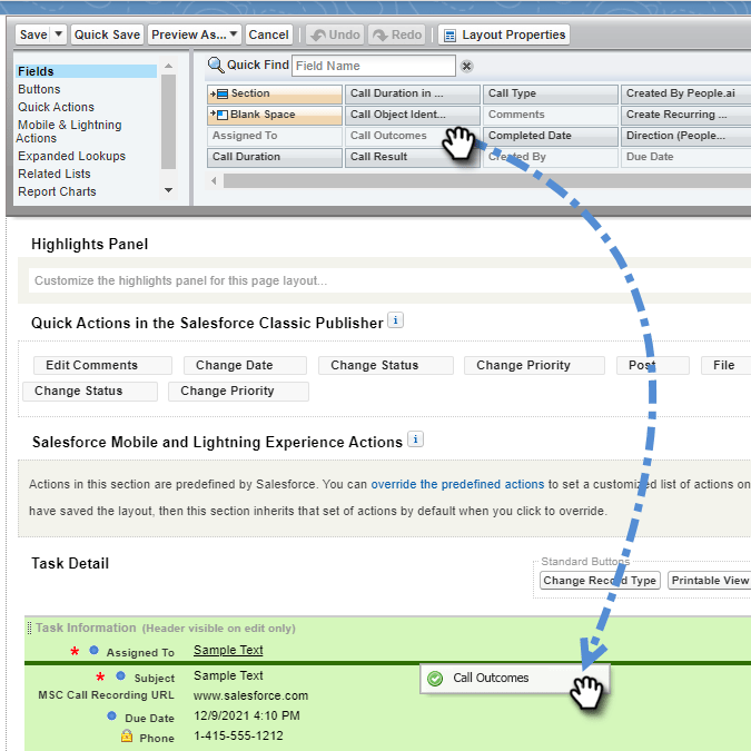 如果您出于报告或可见性的目的,希望将致电结果记录并致电原因Salesforce,则可以为每个创建自定义活动字段。 每个字段必须使用特定的API名称(在Salesforce中称为“字段名称”)。