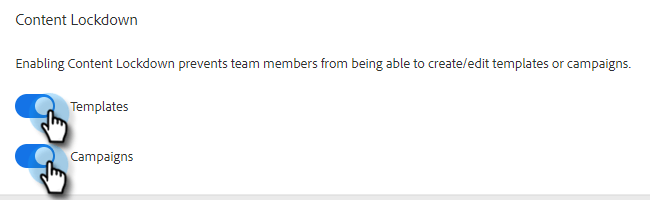 向下滚动到Content Lockdown。 打开任一滑块将禁用团队成员创建/编辑模板和/或营销活动的能力。
