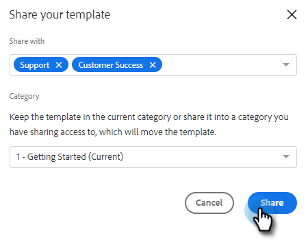 您可以选择将模板保留在当前类别中或将其移动到其他类别。 在本例中,我们将其保留在当前版本中。 完成后单击 Share。
