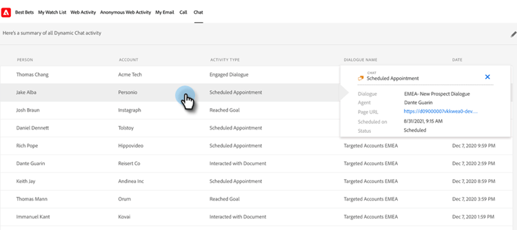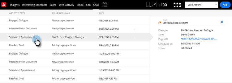 “聊天”选项卡也包含在您的全局Marketo选项卡中。 它包括三种活动类型(Engaged Dialogue、Scheduled Appointment、Reached Goal),以及以下列: