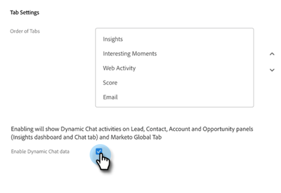 - “全局Marketo”选项卡中的“聊天”选项卡