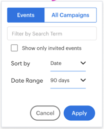 - 筛选器包括“Search”、“Show only invited events”和“Date Range”