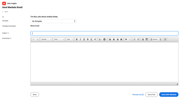 note tip TIP 您可以将电子邮件发布到 Sales Insight并从这些电子邮件中进行选择。 note note NOTE 一次最多可发送200封Marketo电子邮件。