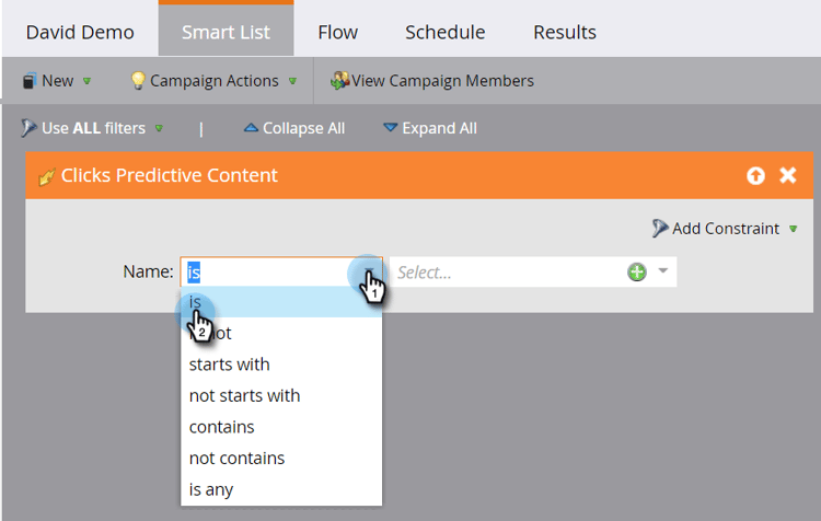 在智能营销活动中定义智能列表时,您可以在触发器和过滤器中使用预测内容活动。 您可以为通过富媒体模板、内容推荐栏或在电子邮件中单击预测内容的任何人触发操作。