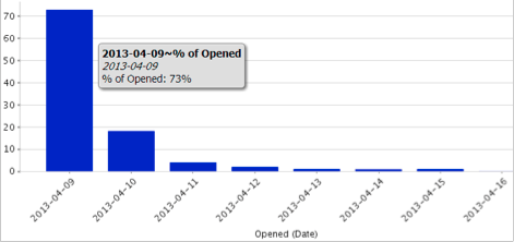 此报告向您显示在发送电子邮件的同一天以及随后的日期中发生的电子邮件打开总数百分比。 当前过滤器包含7天前发送的所有电子邮件。