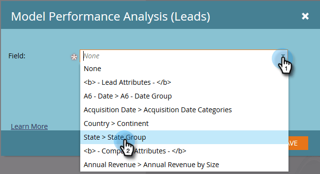 按照以下步骤在Model Performance Analysis (Leads)区域中启用用于报告的自定义字段组。
