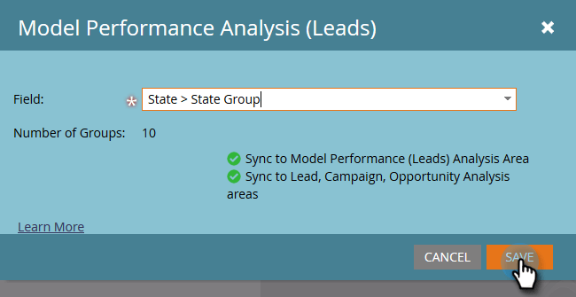 note note NOTE 此示例为标准字段(State)启用了自定义字段组。 因此,只有Model Performance Analysis (Leads)区域受到影响。 如果已为自定义人员或公司字段启用自定义字段组,则启用的组将显示在“同步摘要”选项卡的Model Performance Analysis (Leads)部分中,并且商机、营销活动和机会分析的自定义字段计数将增加1。 -