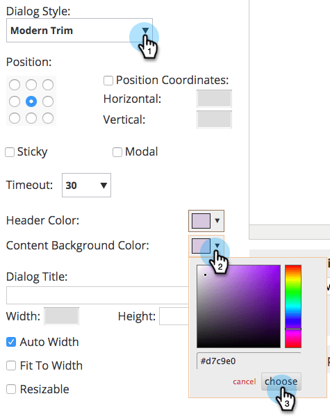 以下示例展示了带有浅紫色标题和背景颜色的“现代修剪”对话框样式的外观。