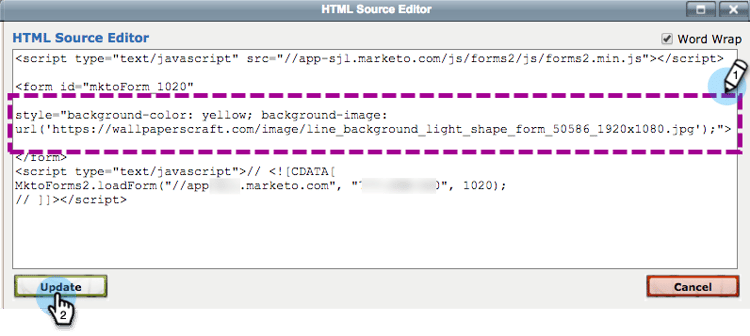 将带有背景样式代码的表单嵌入代码粘贴到HTML Source Editor中。 单击 Update。