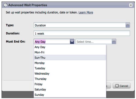 使用新的高级等待属性,您可以将Smart Campaign流量操作中的等待步骤配置为“等待”一周中的特定日期、下一工作日、特定日期或时间。 这些增强功能可确保您的培养电子邮件在工作时间到达收件箱!