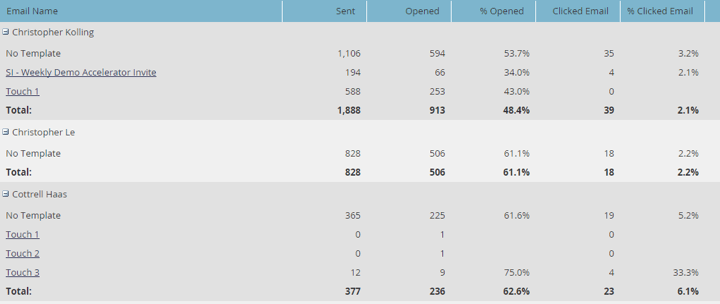 Sales Insight 电子邮件性能报表允许您按电子邮件和销售代表查看电子邮件量度。 它支持通过Salesforce、Microsoft Dynamics、Outlook插件和Gmail插件发送的电子邮件。