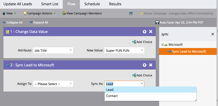 将潜在客户同步为联系人: Sync Lead to Microsoft流程操作有一个新选项,可用于作为潜在客户或联系人进行同步。