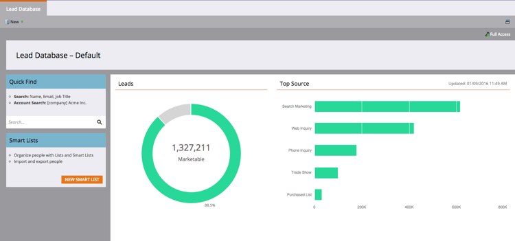 Lead Database更新了“摘要仪表板”,其中包括总人员数据库大小、可销售商机数量以及按前五个来源列出的商机细分。