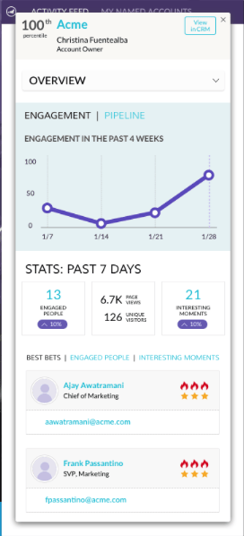 Account Insight 是一个Google Chrome插件,可为您的销售团队提供可操作的ABM和帐户分析,从而使他们能够与营销部门密切合作,从而有效地吸引帐户。 销售团队将了解为其拥有的每个指定帐户生成的数据和见解。 这将包括帐户分数百分比、其指定帐户的优先级列表、这些帐户中的参与人员以及帐户中近期活动的实时活动流。