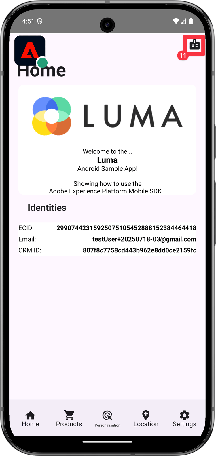 > app > kotlin+java > com.adobe.luma.tutorial.androi > views > HomeView.kt,并找到.onAppear修饰符。 添加以下代码:code language-kotlin // Get attributes UserProfile.getUserAttributes(listOf("isPaidUser")) { attributes -> showBadgeForUser = attributes?.get("isPaidUser") == "yes" }此代码: