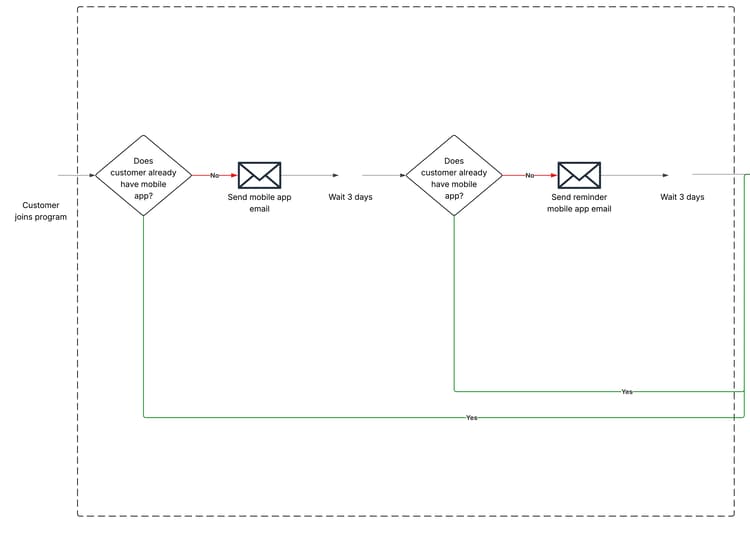 在本示例中,我们使用两个营销渠道引导客户完成三个里程碑。历程策略很简单:发送初始通信,如果客户在该时间段内未完成预期的里程碑,则在几天后发送提醒。