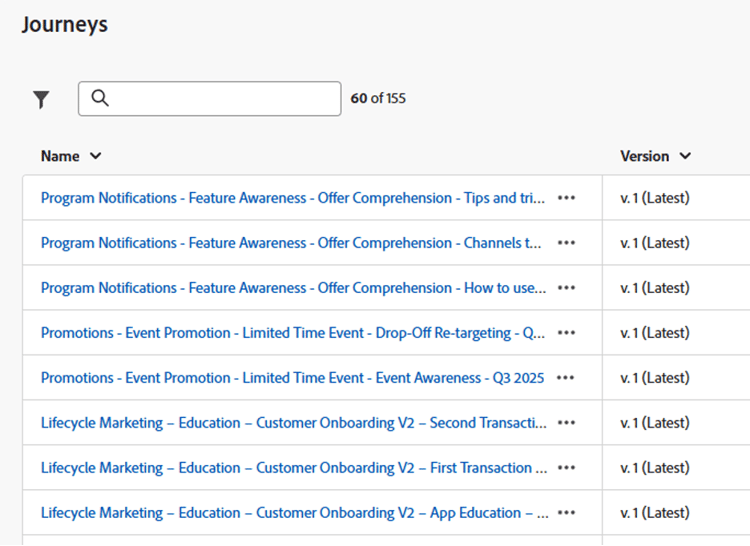 Journey Optimizer 中的标记和标记类别可帮助您完成与命名惯例相关的许多既定目标,而不会像上述示例中那样复杂。团队可以过滤这些标记和类别,而历程名称可以更明确地聚焦于要推动的客户里程碑。