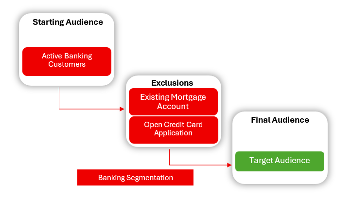 假设您在银行业工作,计划推广一款新的信用卡。您可能想要定位已有账户的活跃客户,但排除那些已经拥有抵押贷款或最近申请了另一张信用卡的客户。使用“组合受众”功能,您可以轻松地在画布上构建这一逻辑,并定位您定义的受众。