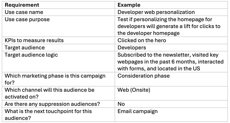 精准定义用例对于成功实施实时客户数据平台至关重要。以下是为实施平台而收集的初始用例需求示例: