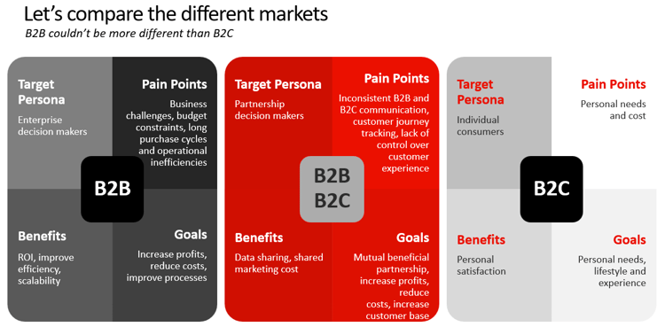 在制定市场进入策略时,必须认识到 B2B 和 B2C 受众的独特特征。它们各自有独特的目标、痛点以及决策行为。B2B 受众(如企业决策者)往往优先考虑投资回报率、运营效率和长期价值。相比之下,B2C 受众通常受个人满意度、便利性和生活方式契合度的驱动。