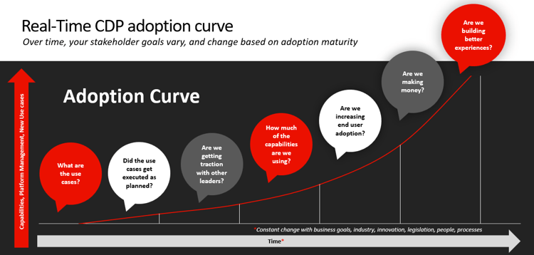 请记住,随着时间的推移,当您继续利用实时客户数据平台扩展能力并提升采用率时,关键利益相关者的目标将会发生变化。最后,将企业营销技术工具集成到日常数字营销运营中需要时间。