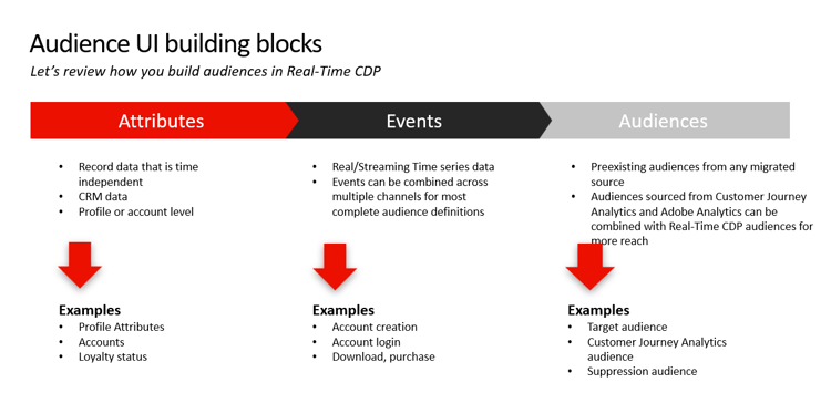 我们来深入探讨实时客户数据平台中构建受众的基础。通过细分用户界面,有三种数据类型可用于构建受众。它们是属性、事件和受众,如下图所示: