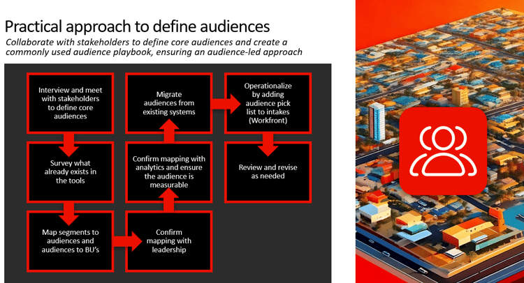 最后,这些受众可以在与受众和活动相关的工作流程中实现操作化,以确保每个请求都映射到特定的受众。例如,您可以在 Workfront 表单和输入中添加受众。这种方法有助于推行变革管理,确保在全组织范围内使用已定义的受众,并制定与实时客户数据平台中构建的受众相一致的持续互动策略和流程。以下是该方法的详细步骤:
