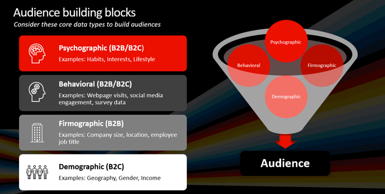 为构建全面的受众画像,营销人员可以利用多种类型的数据,包括心理特征数据、行为数据、公司特征数据和人口统计数据。这些数据类型是定义新受众、构建相似受众以及重新定位现有受众的基础。请查看以下图片,了解数据类型的示例: