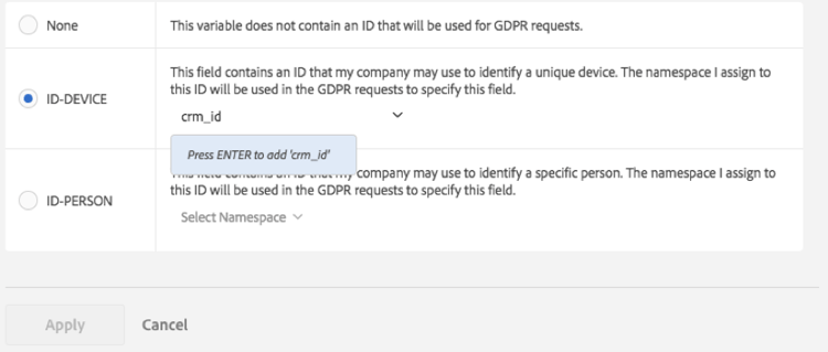 在確定應將哪些標籤套用至哪些變數/欄位之前,您需要先瞭解在 Analytics 資料中擷取的 ID,並決定要將哪個 ID 用於資料隱私權請求。