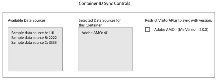 依預設,所有公司都會與Adobe Media Optimizer (AMO)同步資料。 在Admin UI中,每個公司容器都有管理此程式的資料來源。 此資料來源為Adobe AMO (ID 411)。 按一下所選公司的容器列(Containers標籤下),以停用此預設同步處理或新增及移除其他資料來源至AMO同步處理序。