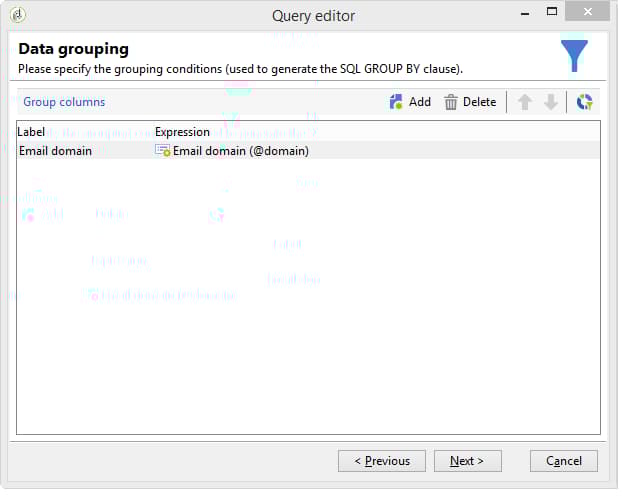 此資料分組視窗只有在已核取 Handle groupings (GROUP BY + HAVING) 方塊時才會顯示。