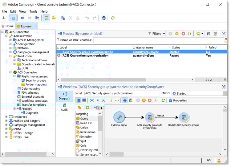 [ACS] Quarantine synchronization(quarantineSync):此工作流程會同步所有隔離資訊。 Campaign v7中的所有新隔離都會複製到Campaign Standard。 Campaign Standard的所有新隔離區都會複製到Campaign v7。 這可確保所有排除規則在Campaign v7和Campaign Standard之間同步。[ACS] Security group synchronization(securityGroupSync):此工作流程用於許可權轉換。 請參閱許可權轉換。