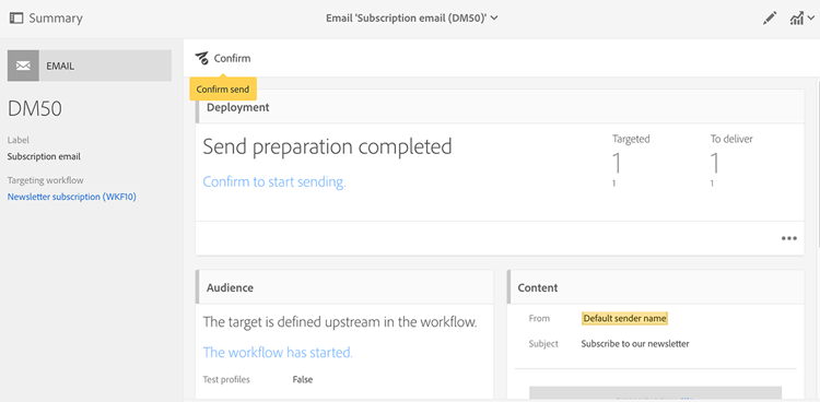 連按兩下 Email delivery 頻道,然後選擇 Confirm 以傳送電子郵件。 按一下 OK 以傳送訊息。