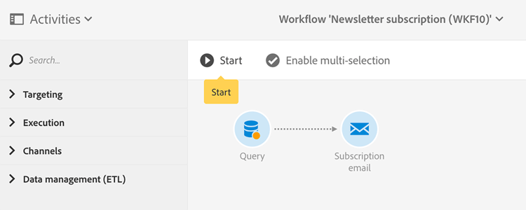 - 在Campaign Standard中建立工作流程:在Campaign Standard中建立工作流程,其中包含具有從Campaign v7復寫之對象或設定檔的查詢。 請參閱建立工作流程。