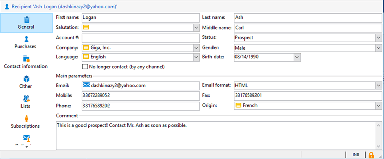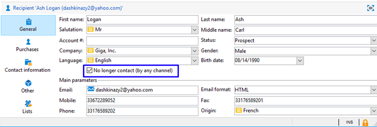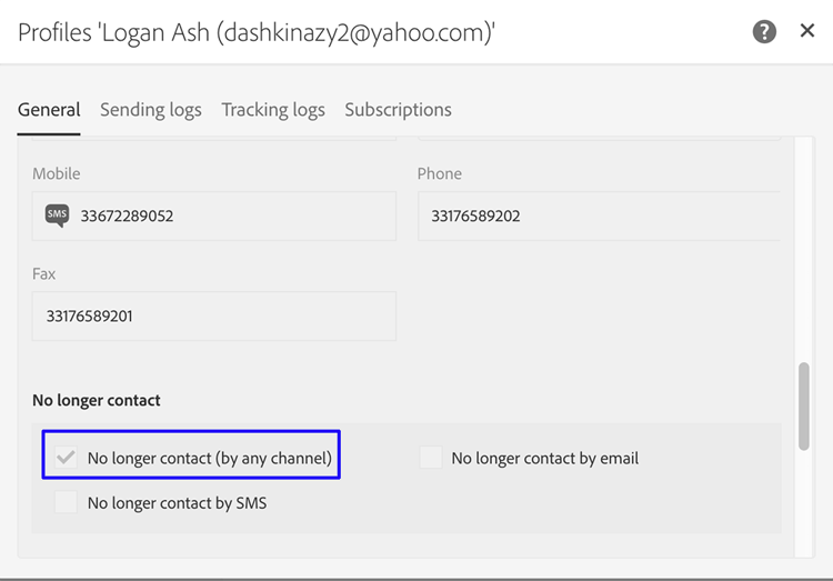 前往Campaign Standard並開啟收件者的設定檔詳細資料。 確認 No longer contact (by any channel) 旁出現核取方塊。 若要瞭解在Campaign Standard中尋找設定檔的位置,請參閱導覽基本知識。