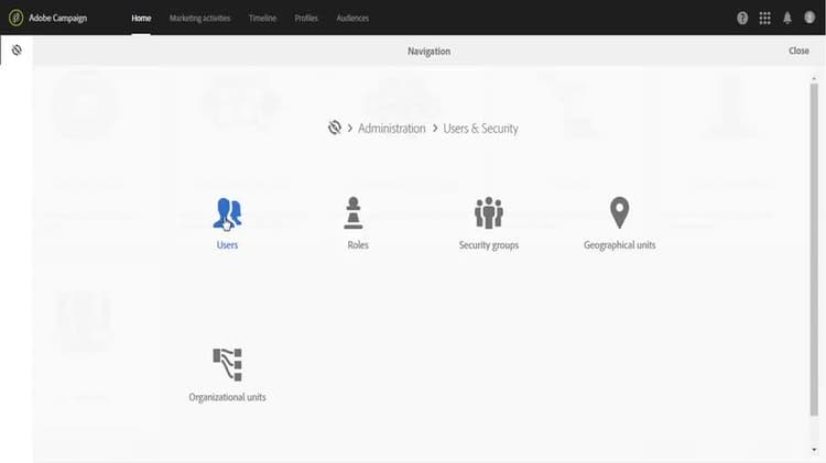 若要在Adobe Campaign中檢視使用者,請按一下左上方的 Adobe 標誌,然後選取Administration > Users & Security > Users。