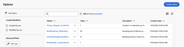 Adobe Campaign網頁版包含技術選項,可讓您更明確地設定應用程式。 這些選項中有些是內建的,有些則可視需要手動新增。